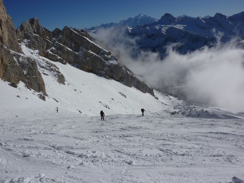 Départ de la cote 1400m de la route du Col de la Colombière. Itinéraire classique de montée vers la Pointe du Midi. Il manque juste un peu de neige au-dessus du Col. La neige n'a pas décaillé de la journée malgré un bon soleil le matin. Bien dure mais skiable quand même avec des carres affûtés.