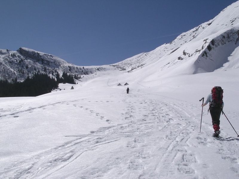 P à 850 m un peu avant les Arolles car route enneigée. Albert nous avait fait la proposition de prendre les skis de fond en plus ; mais il n'y a eu que 2 candidats !!! Pour être plus légers pour monter au col, nous laissons nos sacs aux chalets des Arbets surveillés par 2 vigiles !!! Seule notre téméraire Marie Claude a fait toute la descente à skis !!