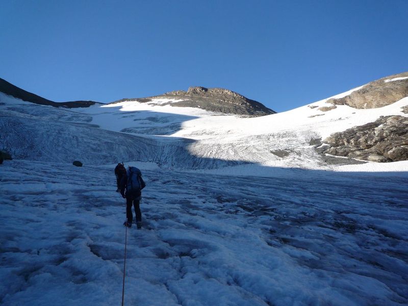 Belle journée, montée soutenue dans un glacier assez raide et arrête sommitale en cailloux. Pas mal de vent et de fraîcheur.