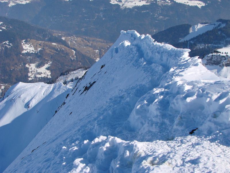 Montée facile jusqu'à 300m de l'arête en suivant une bonne trace. Ensuite, la trace a été effacée et remplacée par une piste de descente dure et lisse de 100m de large. Il y avait la solution de monter à pied << dré dans le pentu >>, skis sur le sac. On a choisi de continuer skis aux pieds côté gauche dans les grattons gelés pour retrouver par moments une trace de montée.