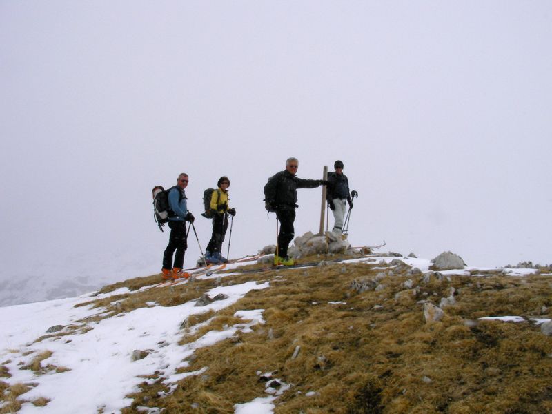 Ciel couvert, montée avec une bonne visibilité sur neige dure, arrivée du brouillard et neige au sommet, descente agréable malgré une petite croûte (pas partout ..) et un faible jour blanc.