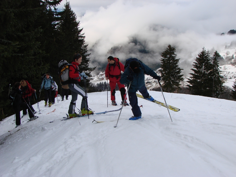 Après la présentation du matériel à l'abri d'un sapin, on tente une sortie... la pluie s'arrête de tomber, quelle organisation !. C'est le moment de pratiquer les premières conversions. L'apprentissage se fait rapidement et après quelques figures non répertoriées dans le manuel, on entend de toute part le "claqué du talon" ... La deuxième partie de la montée permet à chacun de jouer les "premiers de cordée" et de "signer" un morceau de trace de montée.