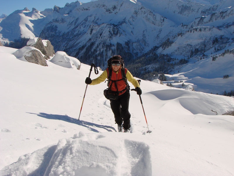 Ambiance fraîche au départ, agréable dans la montée et très ventée au sommet. Neige cartonnée en haut et poudreuse en bas. Ambiance très agréable au 'refuge de la Petite Mya', merci à Gisèle & Momo.