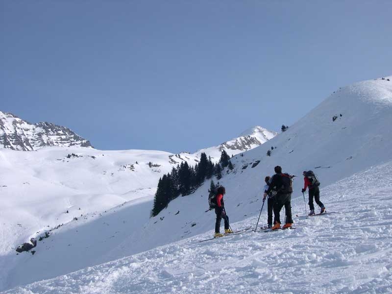 Marie-Hélène emmène un petit groupe directement vers les chalets de l'Aiguille pendant qu'on traverse sous la Pointe de Fornet pour descendre par un petit couloir et les belles pentes Ouest pleines de peuufff.