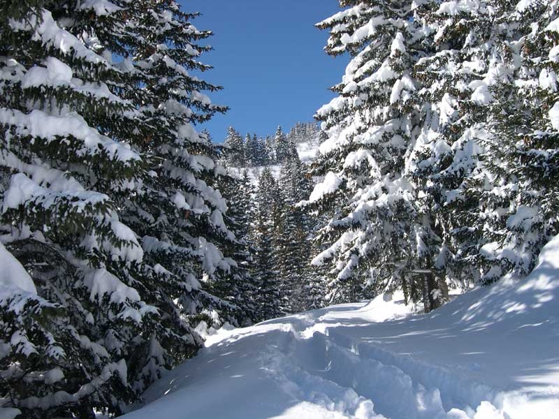 On en profite pour enlever une couche et on monte en forêt dans un paysage de cartes postales : le ciel bleu, les sapins chargés de neige, les chalets, la couche de neige récente...