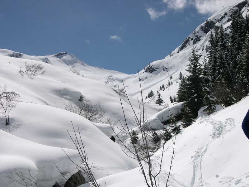 Jusqu'au col, on a une bonne neige de printemps et, vers le bas, la neige s'est déjà bien humidifiée et devient un peu plus lourde. On se souviendra de cette belle descente jusqu'au lac de Saint Guérin.