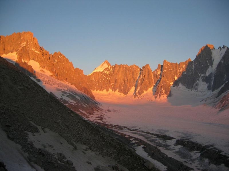 Dimanche : Réveil à 4h pour un départ à 5h. On monte d'abord dans la caillasse de la moraine puis on atteint le glacier des Améthystes. C'est le moment de composer les cordées et de sortir le matériel. La neige a bien gelé la nuit, les conditions sont idéales. On arrive au col à 8h20, le temps d'identifier les sommets et on redescend gentiment par l'itinéraire de montée. On est de retour au refuge à 10h40 pour le casse-croûte de midi... génial. La descente du glacier d'Argentière est longue surtout quand il faut faire le tour de toutes les crevasses. On arrive à la gare de Lognan pour le benne de 16h