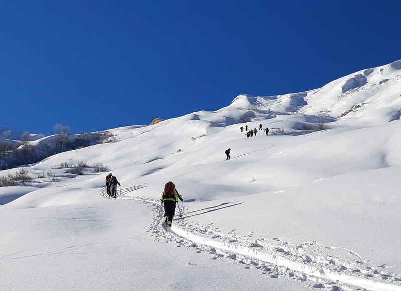 Journée magnifique pour une belle rando bien adaptée au risque 3. De la peûûff en quantité sauf au sommet et dans les parties ventées Ouest et Sud. Replis stratégique au col de la Fenêtre pour le casse-croûte au soleil.