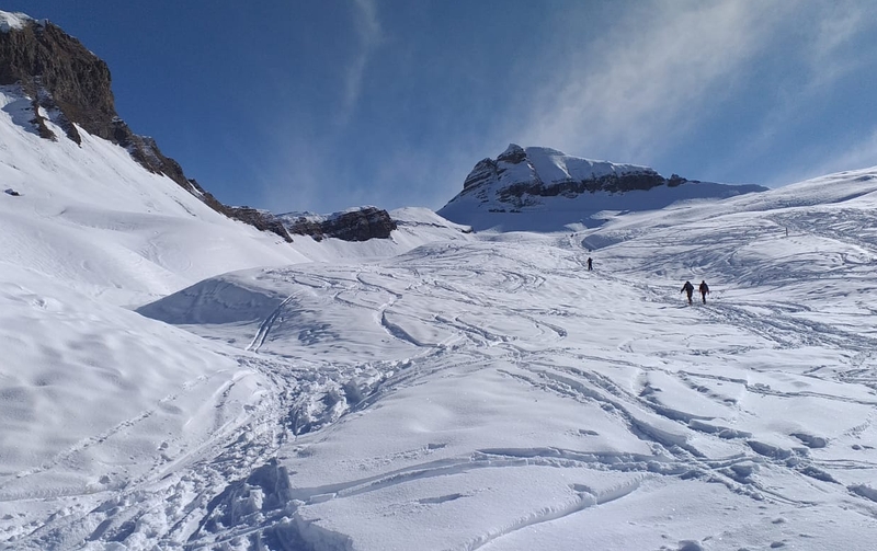 Montée dans une ambiance ensoleillée mais fraîche avec un petit bisolet, qui s’est calmé au sommet. Descente sur une belle moquette de 20 cm de neige fraîche, nous étions tous des moniteurs. Une journée sublime, merci Xavier