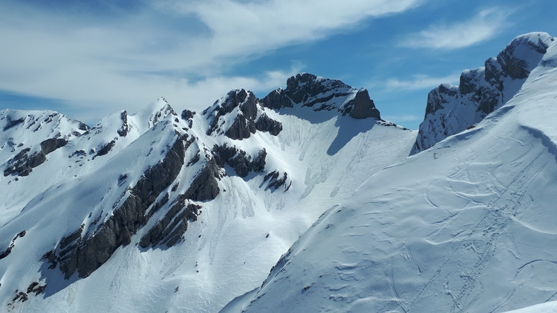 Soleil voilé sur la moitié basse puis un seul nuage gris au dessus du sommet qui a bien rafraichi l'atmosphère et la neige mais retour du soleil au sommet.