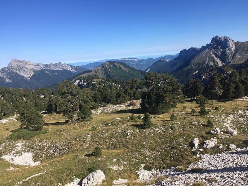 Vue magnifique sous un ciel bleu d'azur mais bien ventée. Du coup pour le pic-nique nous préférons descendre par le pas de l'oeille pour trouver un endroit plus à l'abri.