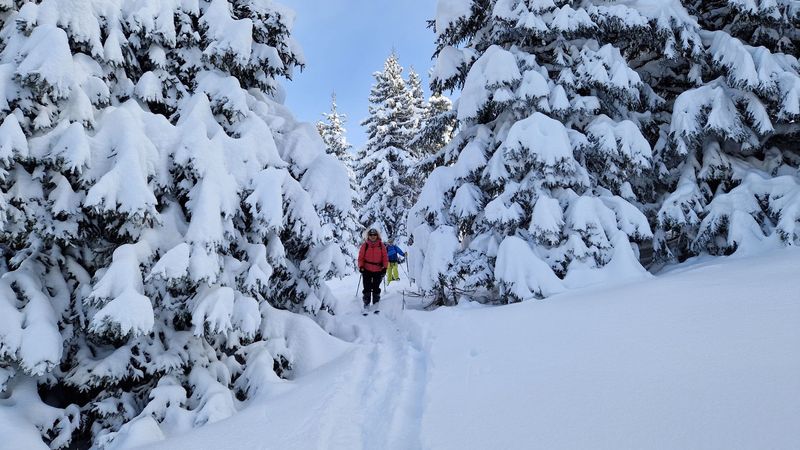 Montée tranquille dans un paysage sauvage et calme puis descente sans difficulté au travers des sapins enneigés.