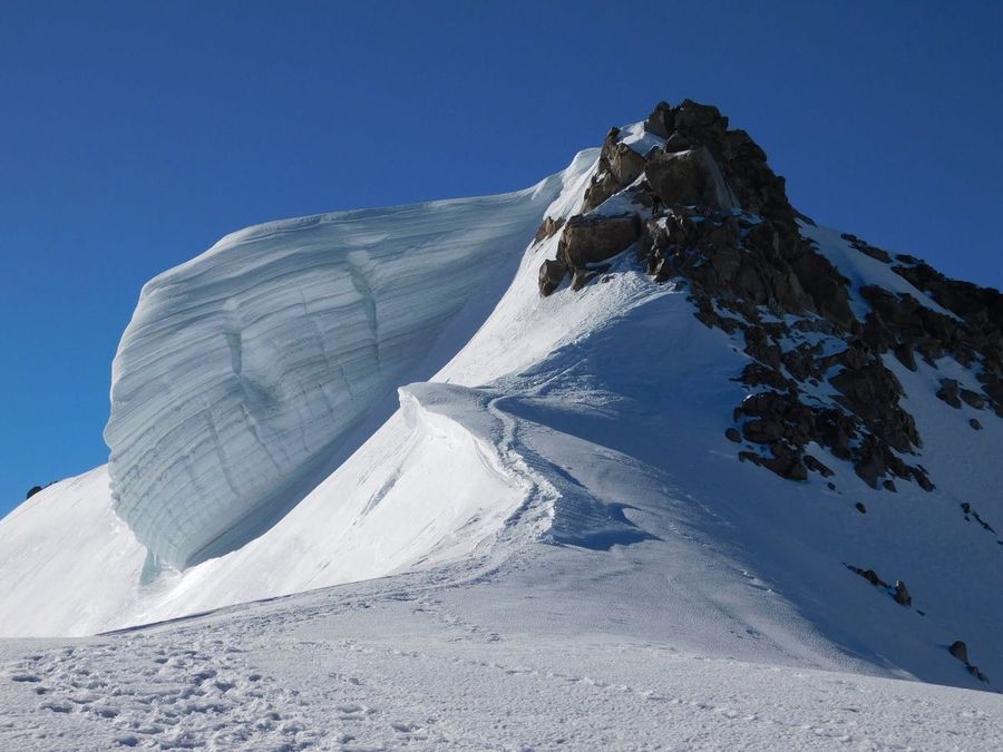 Premier sommet de la saison qui a permis de travailler l'acclimation à l'altitude. Après avoir dormi au refuge des Cosmiques, grand beau le matin malgré un peu de vent. Une trace absolument directe vers le sommet cette année et qui ne passe pas par l'épaule comme habituellement! Quelques rochers pour terminer et une grosse corniche de neige qui ne demande qu'à tomber.