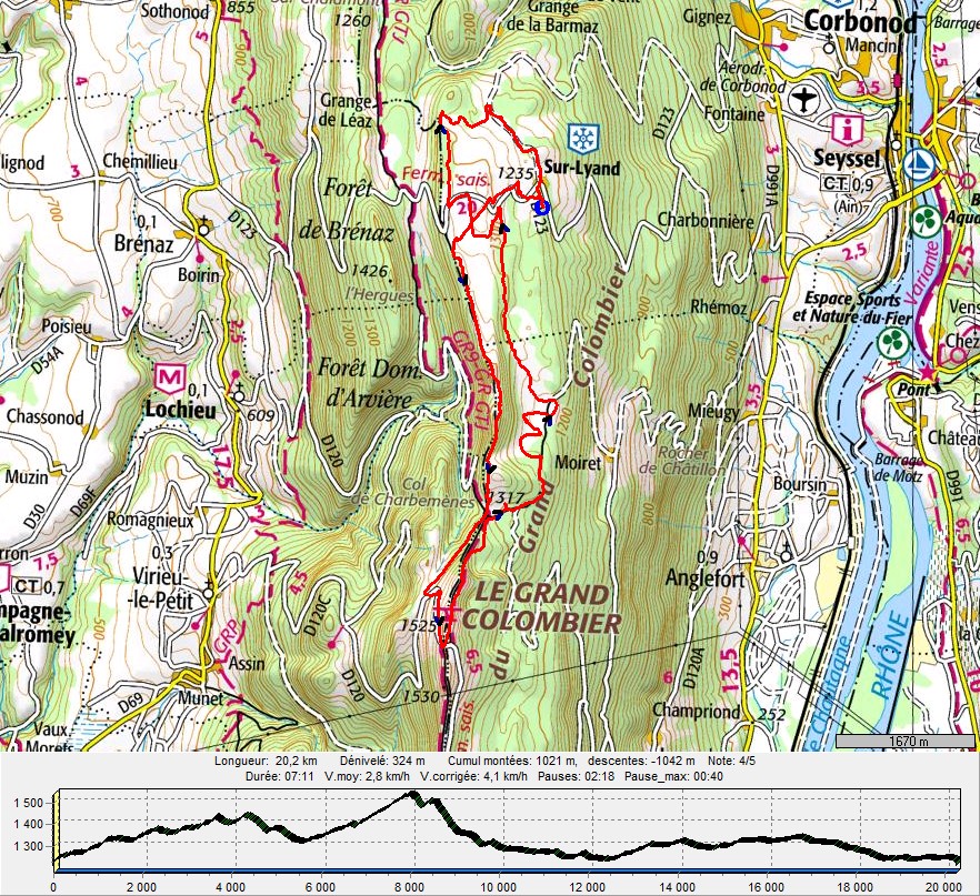 Départ du foyer de ski de fond Sur Lyand, Croix de Famban, les Crêtes jusqu'au Col de Charbemènes, chemin forestier pour les Granges du Colombier puis le sommet par la D120, retour vers Charbemènes par le GR 9 pour éviter une pente en dévers trop gelée, puis cheminement selon nos envies sur ce somptueux plateau et pour terminer 7kms de pistes damées nous permettent de retrouver nos sensations de jeunesse dans le pas alternatif. Parcours toujours aussi magnifique (vue sur toutes les montagnes alpines, le val de Fier, le lac du Bourget) et sans monotonie thermique puisque s'est opposé à la douceur du plateau un puissant vent à nous clouer sur la croix du sommet.