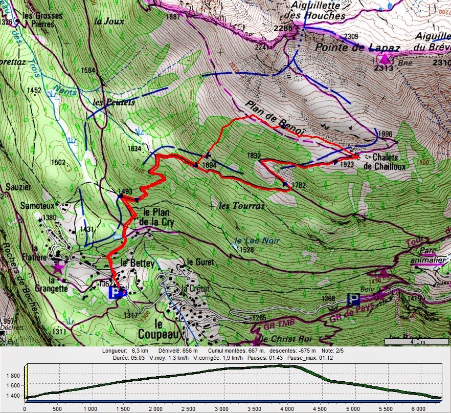 Le téléphérique de l'Aiguille du Midi étant fermé pour cause de vent violent, nous nous sommes rabattus sur l'autre versant de la vallée de Chamonix au départ du Bettey. La montée aux Chalets de Chailloux se déroule dans la forêt à l'abri du vent et des avalanches. Très beau point de vue à l'arrivée sur les sommets du massif du Mont Blanc "fumants" pour cause de vent (80 à 100 km/h). Traversée sous l'Aiguillette des Houches, pique nique au soleil et exercice DVA. Puis descente "Dré dans l'pentu" façon "sangliers".