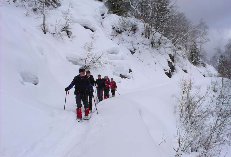 Départ sous les nuages qui ne nous quitteront pas malgré des prévisions météo plus optimistes. Temps agréable pour autant et surtout très belle neige fraîche à tracer… Des percées dans les nuages aux pâturages de Miage qui nous ont permis d'entre-apercevoir les Dômes de Miage.