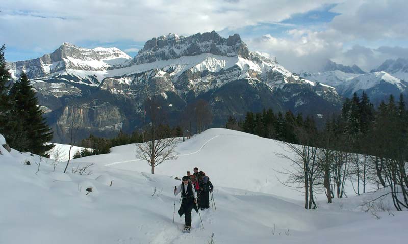 Après un départ sur "terrain sec", nous avons trouvé la neige pour chausser les raquettes vers 1300 mètres. Une boucle autour des chalets de Mayères nous a permis d'admirer le massif du Mont Blanc entre les nuages.