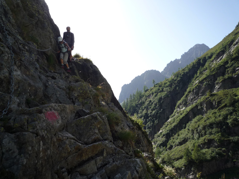 Très belle et très chaude journée. Départ de la halte de chemin de fer du Buet. Peu après nous découvrons l'histoire peu ordinaire de feu Joseph Farinet et l'emplacement de la grotte du même nom (voir photo). Après avoir traversé le torrent "L'Eau Noire" nous grimpons à travers une très belle forêt pour pénétrer dans la vallée de Tré les Eaux. Nous sommes accompagnés constamment par le bruit du torrent. Sur notre gauche l'ombre du Mont Oreb, l'arrête des cristaux et le Buet. Nous franchissons un passage un peu raide avec des chaînes au niveau de "la gouille du Bouc". Arrivés sur un replat nous découvrons le glacier du Buet. Nous reprenons notre grimpée tournant franchement sur la droite, avec comme point de mire la ligne à haute tension qui file sur Barberine. Un peu fatigués, nous découvrons plusieurs petits lacs qui nous remtivent. Nous déjeunons au bord de l'un d'eux avec le Mont Blanc comme ligne d'horizon. Après le repas nous atteignons rapidement le Col de la Terrasse d'où nous dominons toute la chaîne Nord du Mont-Blanc ainsi qu'une bonne partie des sommets Suisses. En bas, nous apercevons les 7 ou 8 petits chalets de la Loriaz. Nous attaquons la descente très raide, attention aux chutes de pierre, pour atteindre les chalets de la Loriaz (Refuge du TMB) et refaire de l'eau. Ensuite nous rentrons dans la forêt, sur un très beau sentier, cascades, ponts de bois, ... pour arriver (enfin) au Buet.