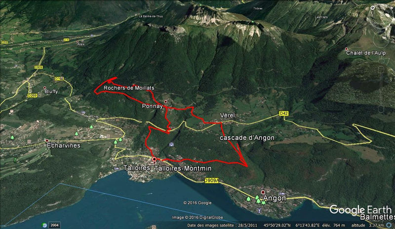 Circuit en 8 méconnu sur les hauteurs du lac d'Annecy au départ de Talloires, au pied des Dents de Lanfon, du Lanfonnet et de la Tournette, passant par l'Ermitage St Germain et la cascade d'Angon et offrant de belles perspectives.