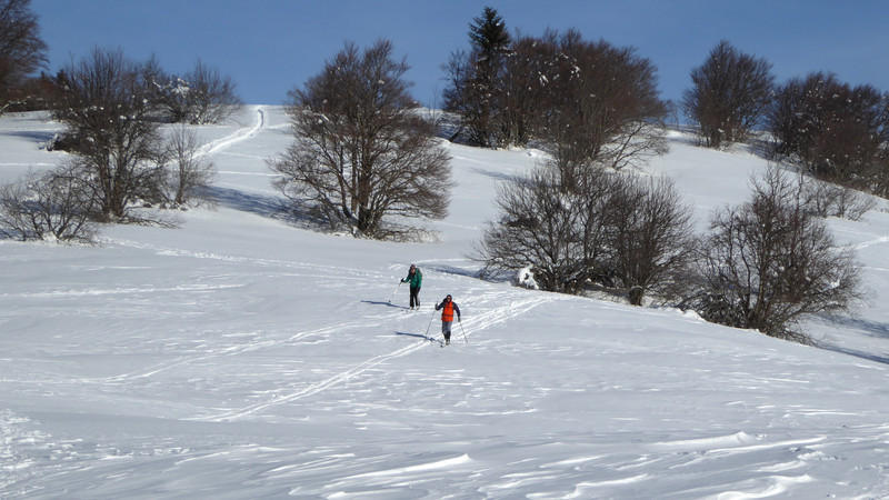 La neige travaillée par le vent nous a privés du sommet, la descente aurait été délicate. Si non, neige lourde en transformation sans réel plaisir. En plus du décor fabuleux, la récompense a été la fin de parcours sur 6 kms de piste damée où nous avons retrouvé les sensations de nos jeunes années de fondeur.