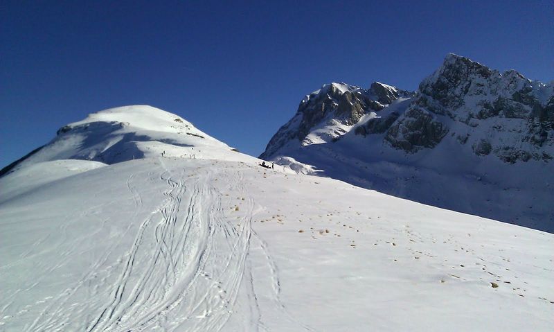 Parti pour le col du Fornet !!…. Vu le manque de neige, nous prenons le chemin du col de la Golèse. Le chemin est un peu gelé mais skiable .. Bonne neige pour monter à la Tête de Bostan … un peu de croute à la descente !! Ciel bleu toute la journée ..