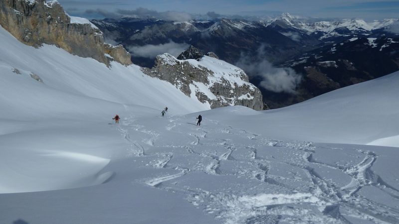 Montée classique jusqu'au fauteuil où l'on ne s'est pas éternisé car le vent était trop violent. Pour la descente, dans la partie au-dessus du chalet de Rosairy, il restait encore des pentes de neige vierge pour faire nos traces. Belle rando !