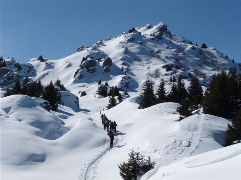 Avec une belle poudreuse et le beau temps cette rando fut très agréable même sans voir le sommet. La descente a été l'occasion de travailler le hors trace en raquettes.