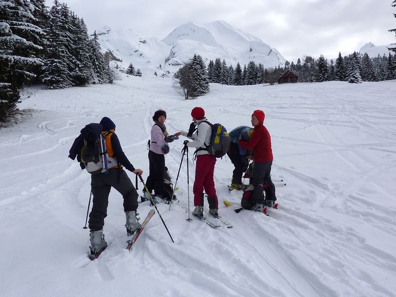 Départ des Dzeures en pente faible : pas tournants, franchissement d'un passage + raide et bientôt la fameuse conversion, et mise en pratique dans la combe au-dessus du chalet dans une pente moyenne, dans la peuufff. Après le casse-croûte bien mérité à la cote 1720m la descente dans la peuufff a été très bien négociée jusqu'en bas où il fallait éviter les taupinières, les cailloux, les clôtures ... La présentation de l'ARVA a mis en évidence la nécessité de multiplier à l'avenir les exercices pratiques.